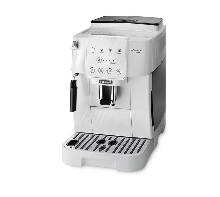La Gamme de machines à café à grain DeLonghi Magnifica se réinvente avec les Magnifica START. Sa carrosserie en ABS blanche est rehaussée par des touches d’inox, notamment sur la buse vapeur.