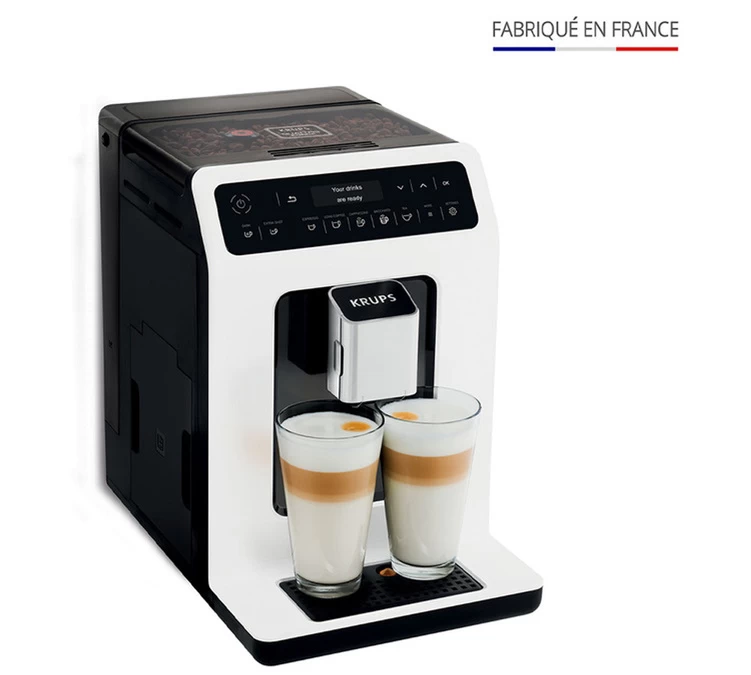 Fabriquée en France, la Krups Evidence blanche est une élégante machine expresso broyeur qui sort son épingle du jeu dans le monde des cafetières expresso. Elle réalise 15 recettes différentes disponibles depuis les touches tactiles pour le plaisir de tous les gourmands ! Vous pouvez qui plus est réaliser deux boissons simultanément pour partager un moment onctueux à deux. Garantie 2 ans – Offre-cadeau – Livraison gratuite.